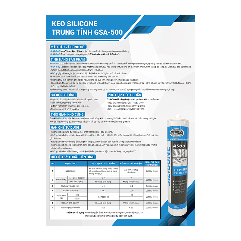 Keo Silicone GSA 500 là loại keo cao cấp một thành phần, lưu hoá trung tính, không ăn mòn tấm nhôm, kính tráng, bê tông, đá Granit và các VLXD khác.